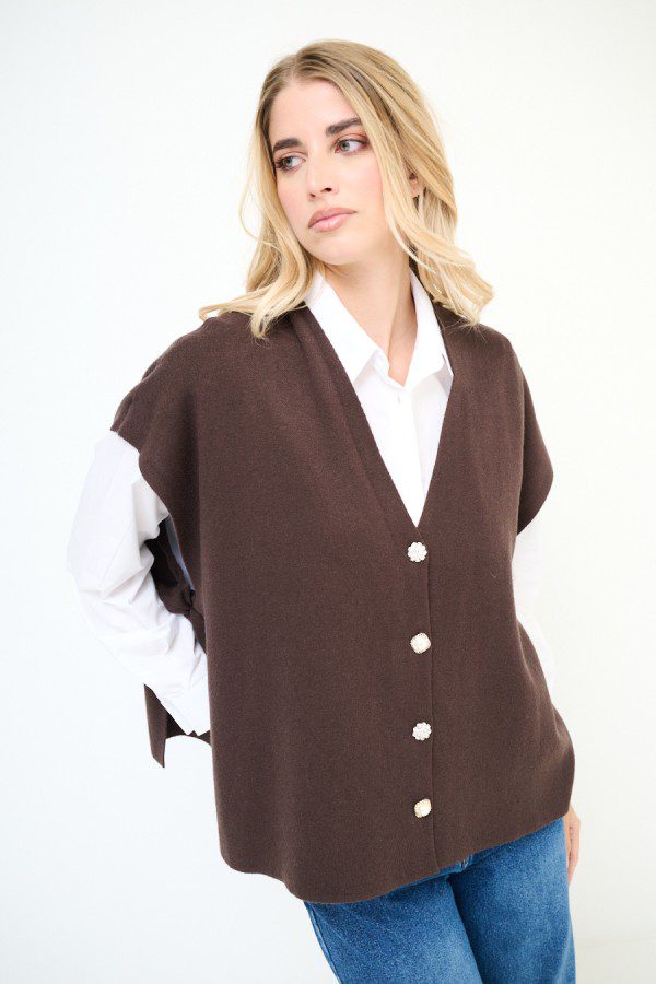 Zajímavým detailem jsou u hnědé vesty otevřené rukávy a boční díly spojené mašlí, které vestě propůjčují jedinečný vzhled a vzdušnost. Materiál s podílem viskózy je příjemný na dotek, měkký a dobře drží tvar. Perfektní volba pro vrstvení přes košili nebo tričko – do práce, města i na posezení s přáteli.